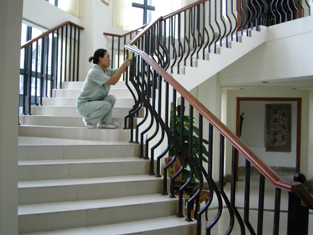 7、 地角線保潔:用濕毛巾擦拭,著重處理沒有清潔掉的漆點(diǎn),再用干毛巾擦拭后分材質(zhì)而噴上家私蠟。